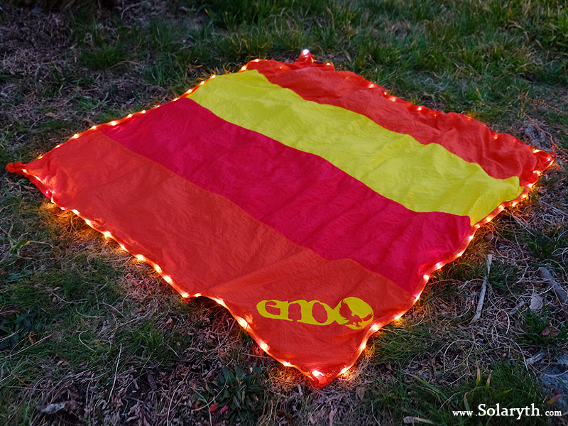 Eagle Nest Outfitters ”ENO”の光るLEDブランケットです。これはかなり目立ちますね。キャンプはもちろん花火・お花見にもどうぞ!頑丈なパラシュート生地です。 非公式な使い方ですが、写真のように光るタープとしても使ってみました。 元々タープ用ではないんですが、テンションさえ気を付ければ・・・魔法の絨毯がド目立ちタープへ。 強度的に心配な方は、四隅のストラップ部を縫って補強すれば完璧かもしれません。 (破損等の責任は負えません) 点灯パターンは4つ。常時点灯(強)・常時点灯(弱)・ゆっくり点滅・速く点滅 カラーはサンシャインカラーと言われる赤・黄色・オレンジです。 ステークスもオレンジアルマイトのものが付属します。 サイズ 186×186cm 210デニールリップストップナイロン スタッフサック・ペグ付属 単四電池3本 IPX4防水 538g
